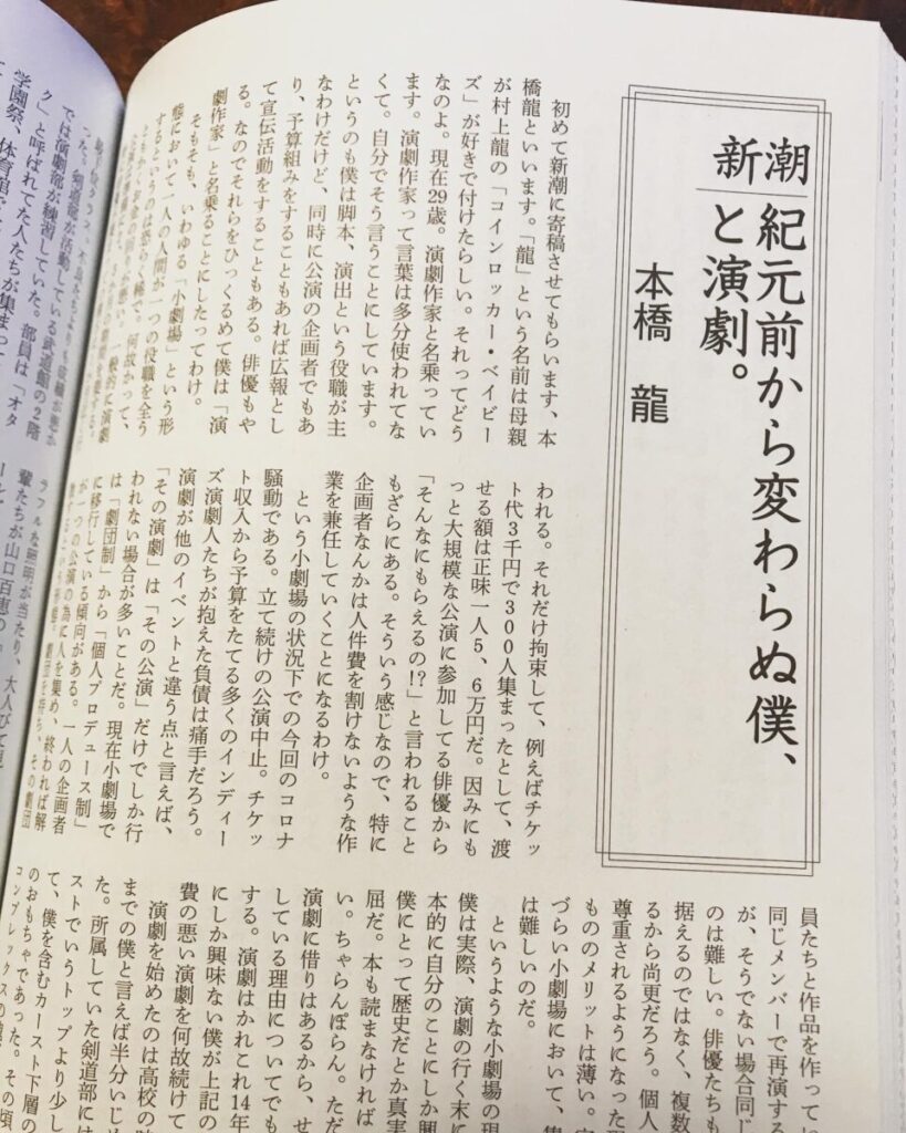 2020年5月7日発売の月刊文芸誌「新潮」6月号にて本橋龍のエッセイ「紀元前から変わらぬ僕、と演劇。」が掲載されました。